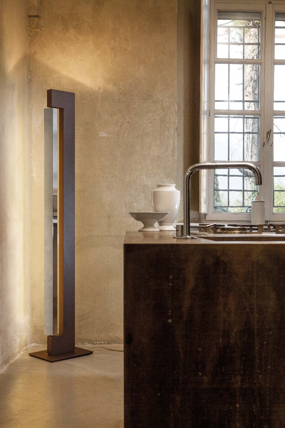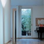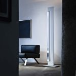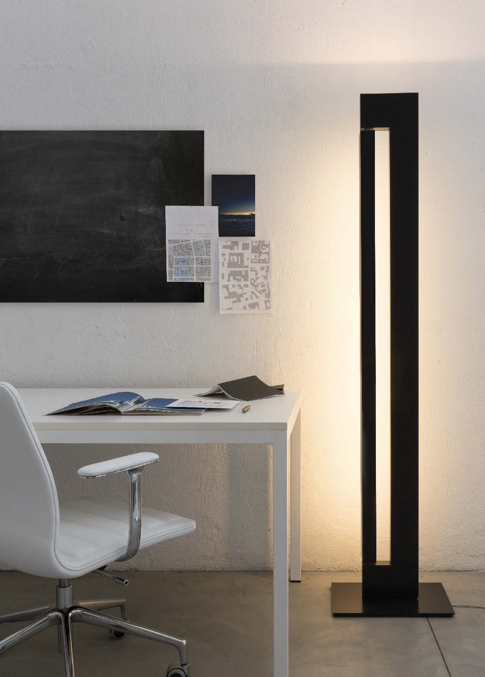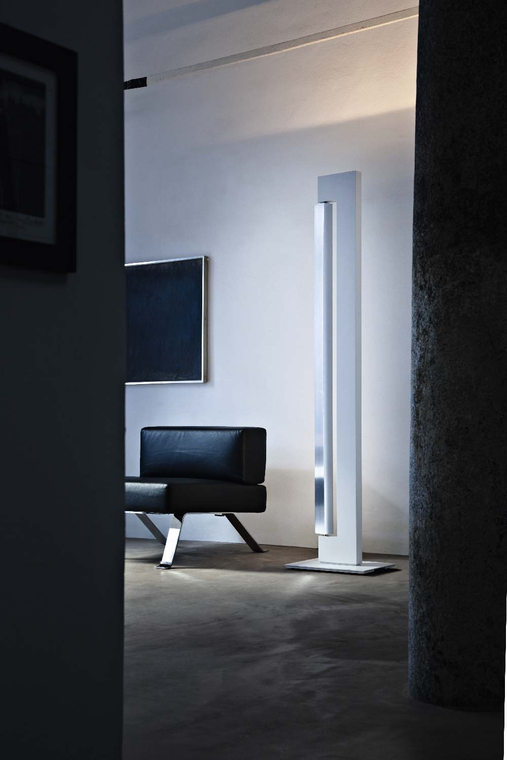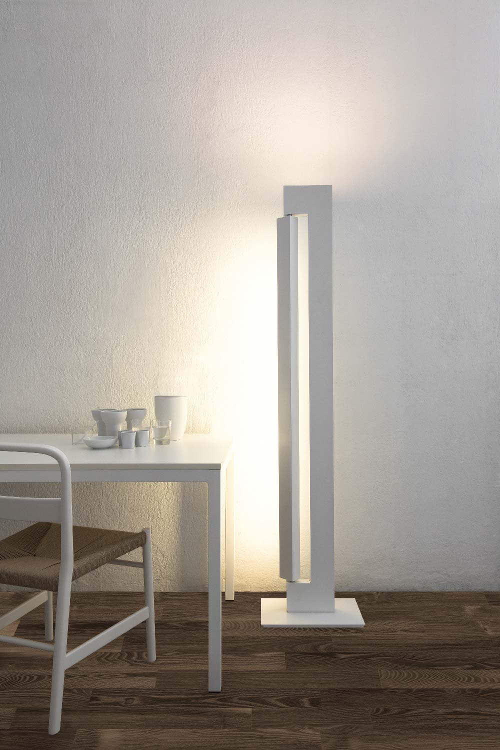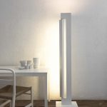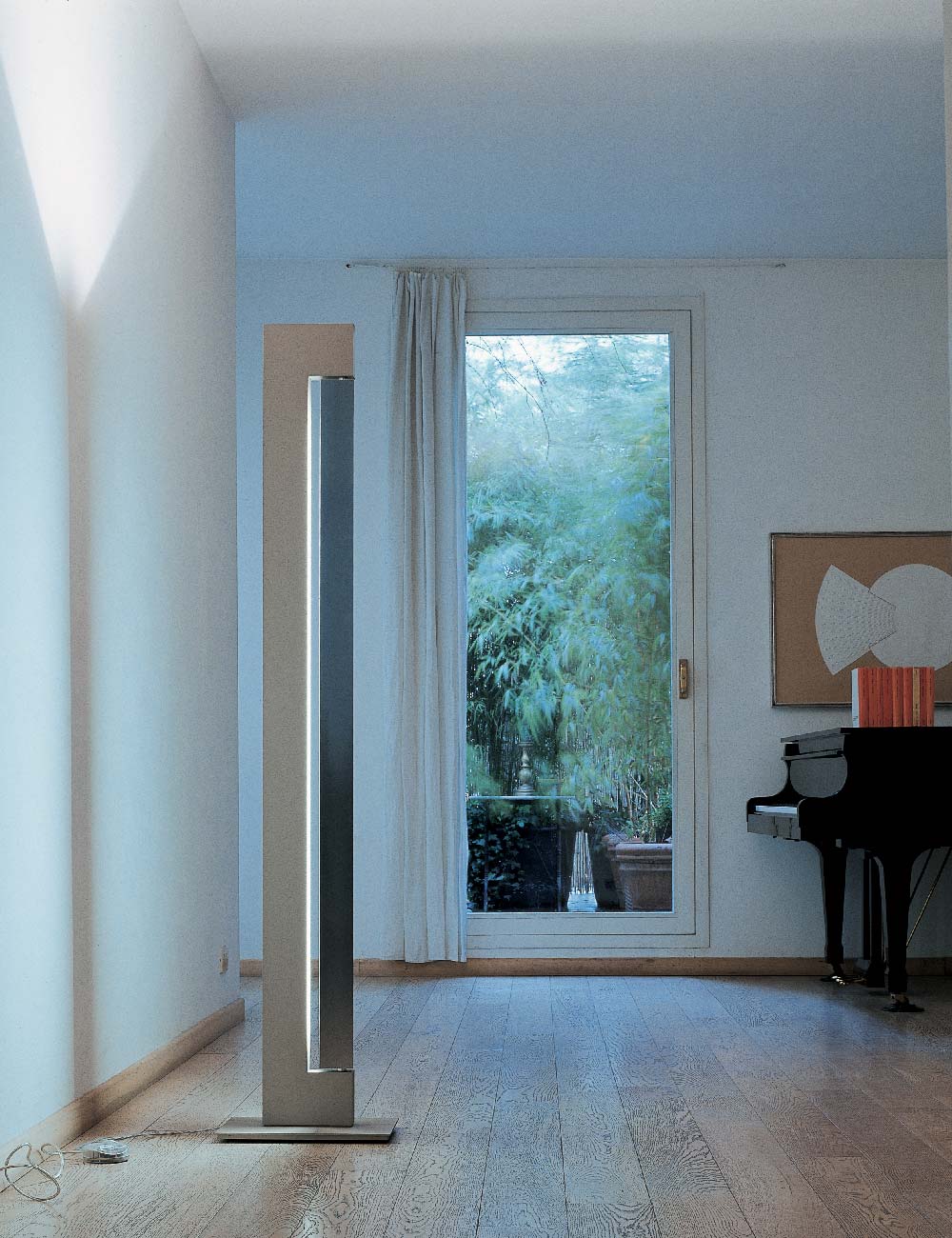 Lampada da terra con sorgenti fluorescenti, LED e alogene a seconda delle versioni. Composta da due elementi in alluminio estruso. A seconda dei modelli, il corpo è verniciato nelle colorazioni bianco, antracite, champagne e moka, mentre il rotante può essere brillantato o verniciato bianco o antracite. La sorgente uplight incassata nel corpo è LED o alogena e crea una luce diffusa verso il soffitto, nel rotante invece è presente una sorgente fluorescente o LED per un’illuminazione diffusa e orientabile. L’alimentazione è integrata nel corpo della lampada. Dimmer con doppia accensione su cavo.