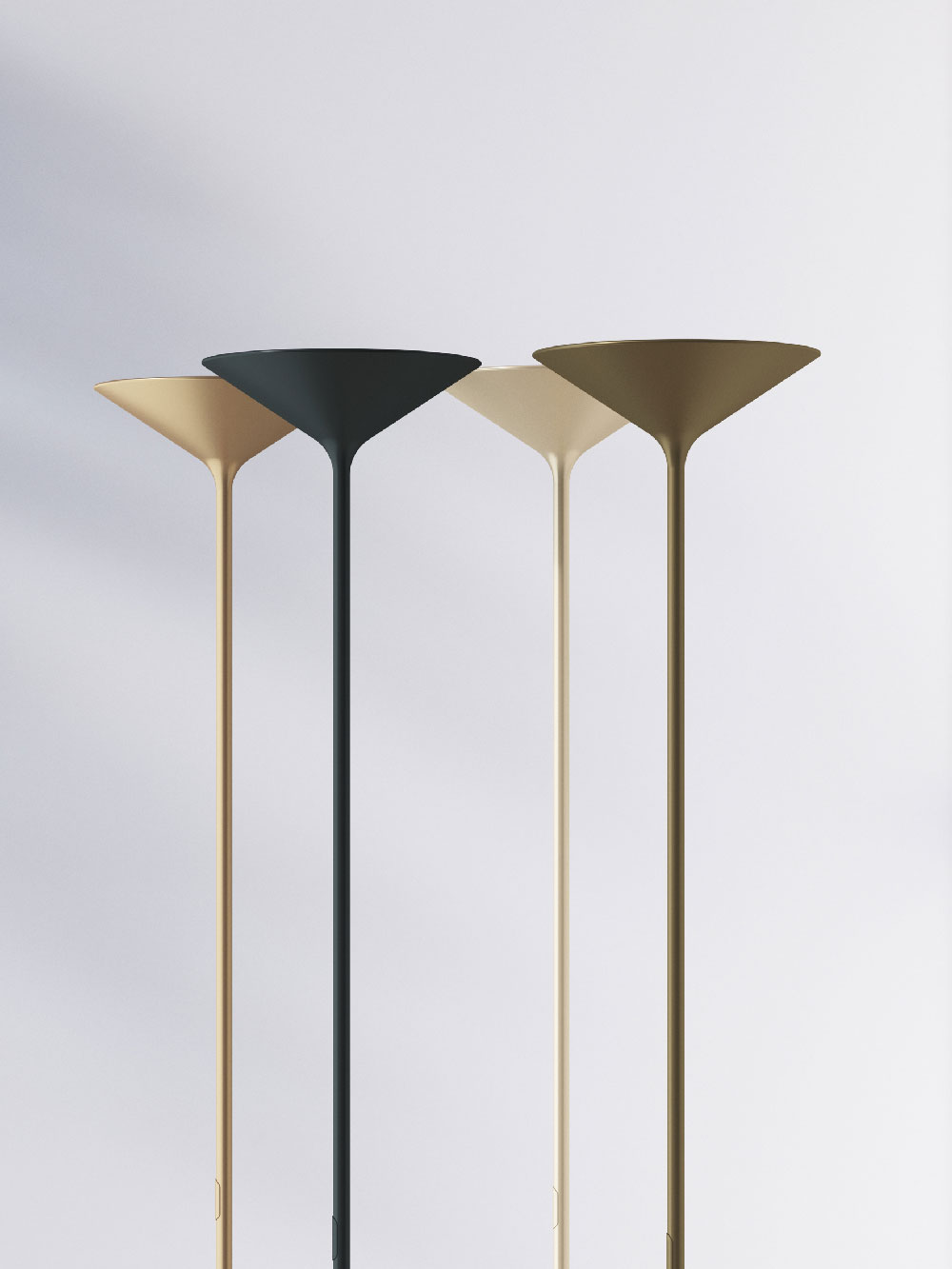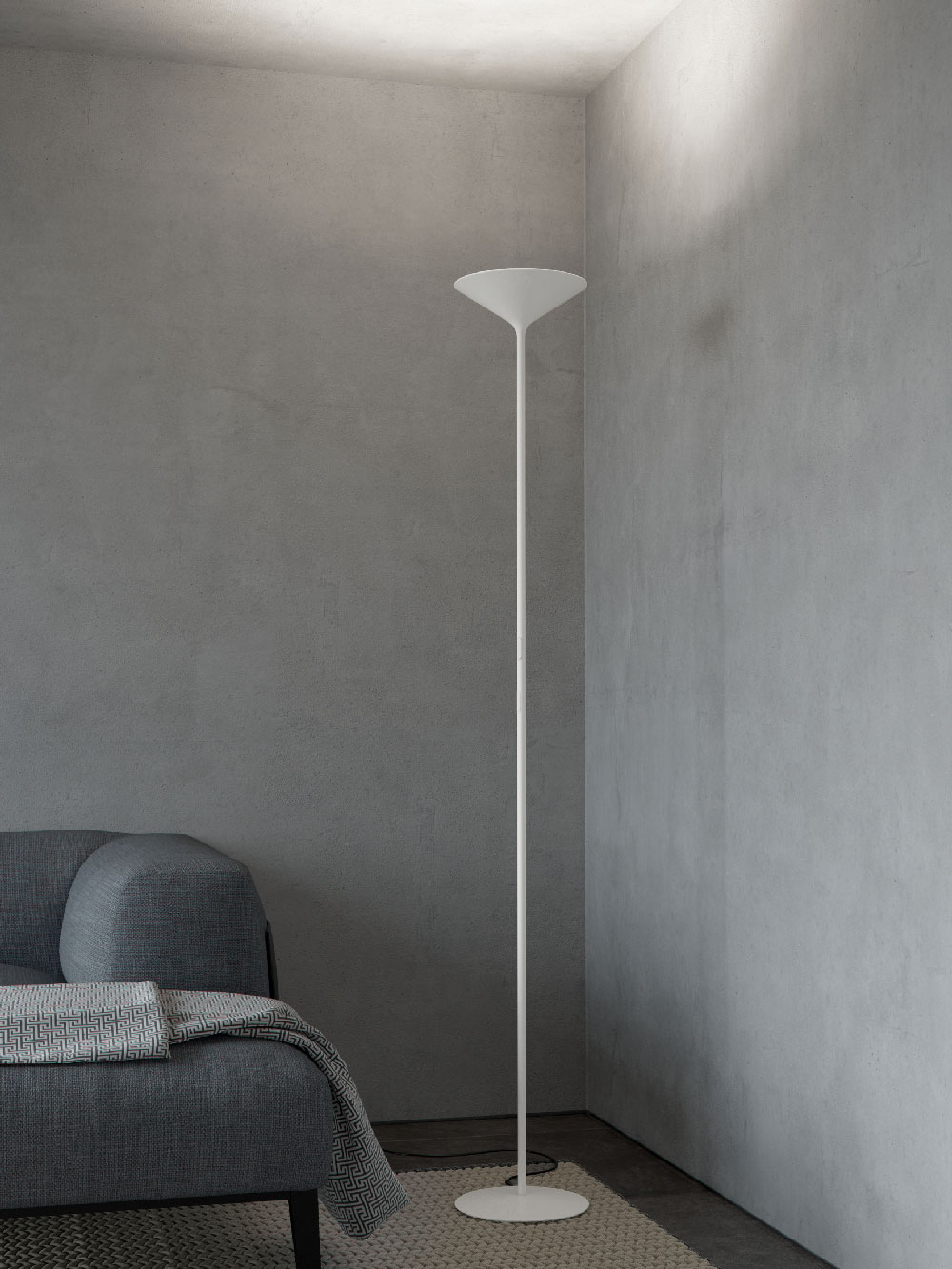 Sottile ed elegante come un calice da cocktail, Dry è una lampada a LED da terra in acciaio verniciato, che emette un intenso fascio di luce indiretta verso l’alto. Sullo stelo è inserito un pulsante a sfioro che ne regola l’accensione e l’intensità.